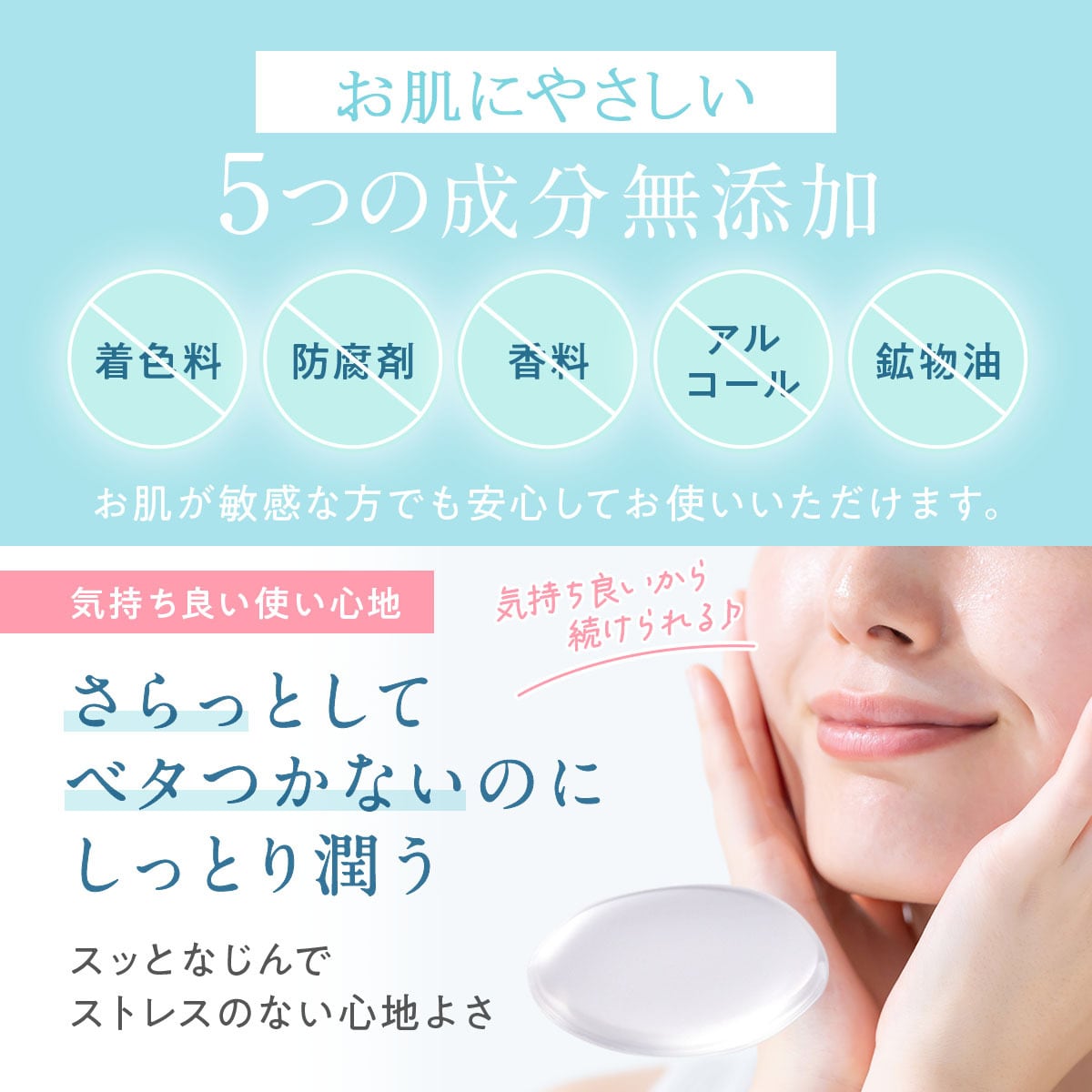 お肌に優しい「無添加」処方。アルコール・着色料・防腐剤・香料・鉱物油は一切使用しておらず、敏感なお肌をしっかりと守ります。